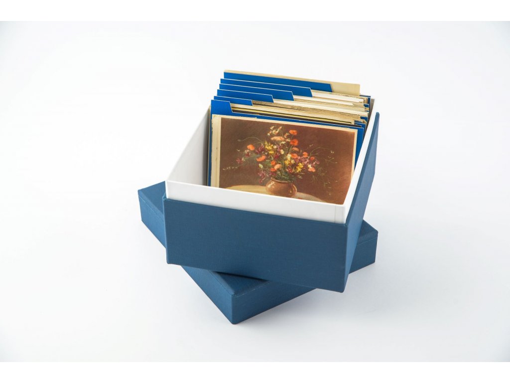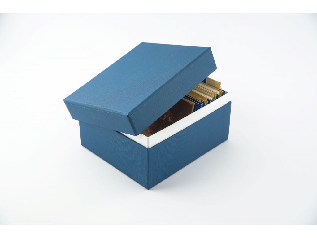 Krabice je vyrobená s úctou ke knihařskému řemeslu v naší pražské dílně. Kartotéka je potažená barevným odolným plátnem a vnitřek je vyroben z pevného kartonu.